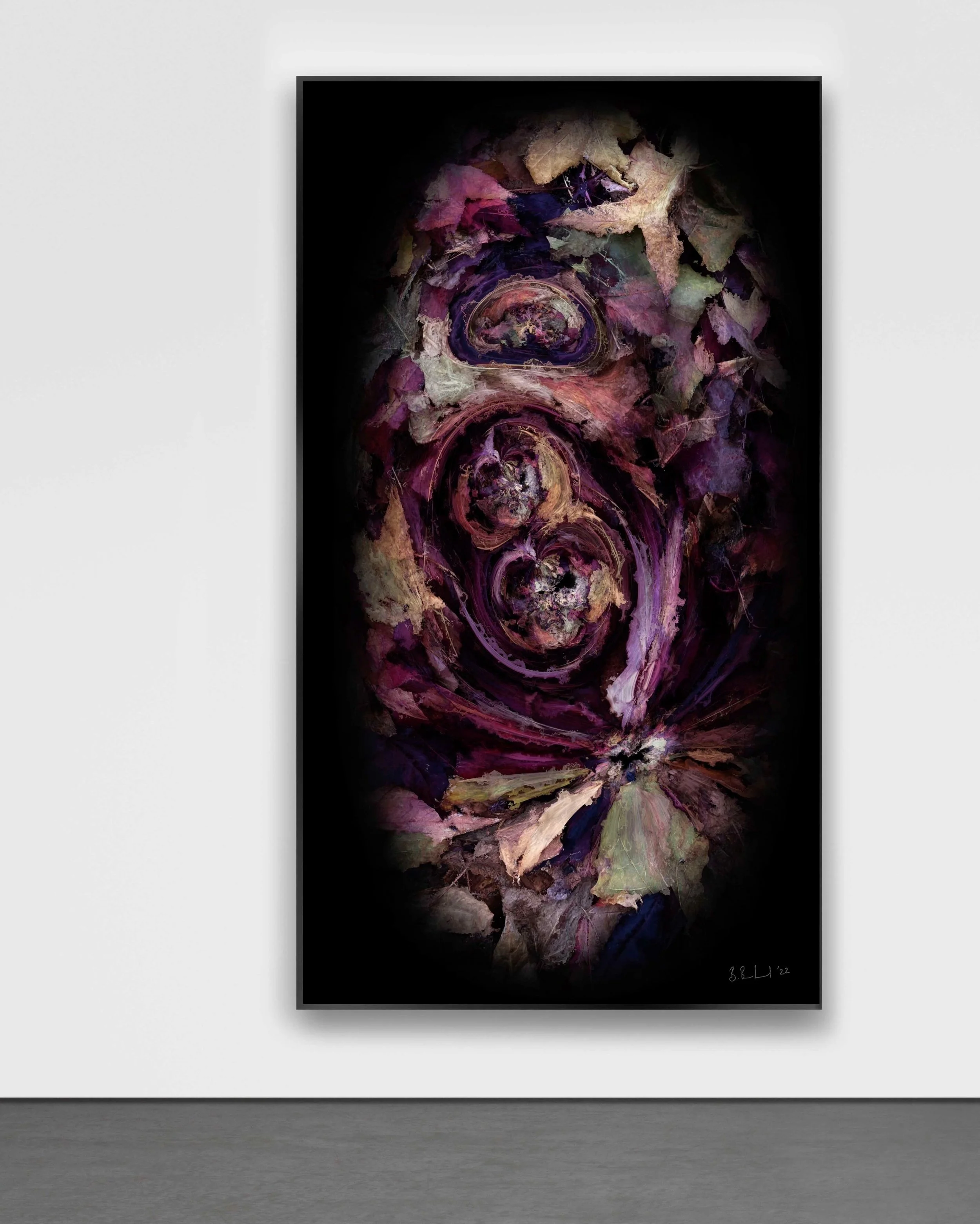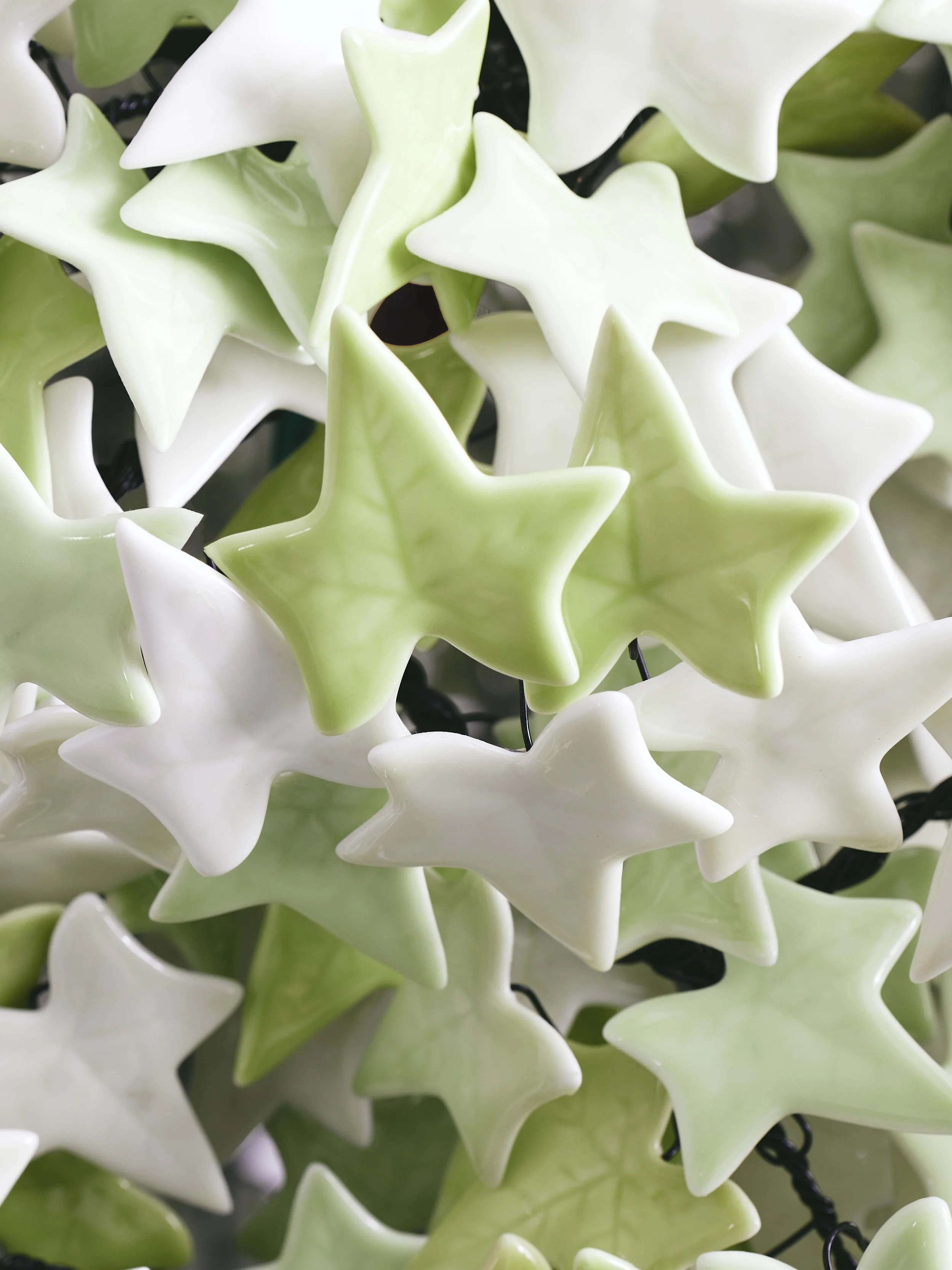 Barford overlays the photographs, crafting intricate layers that gradually evolve over a loop lasting an hour and a half. What was once a simple snapshot of nature, hypnotically blossoms into galactic scenes, microscopic realms, and even tribal masks. A large light sculpture, composed of 9,000 individually crafted celadon-glazed ivy leaves, throws a dappled light around the gallery.