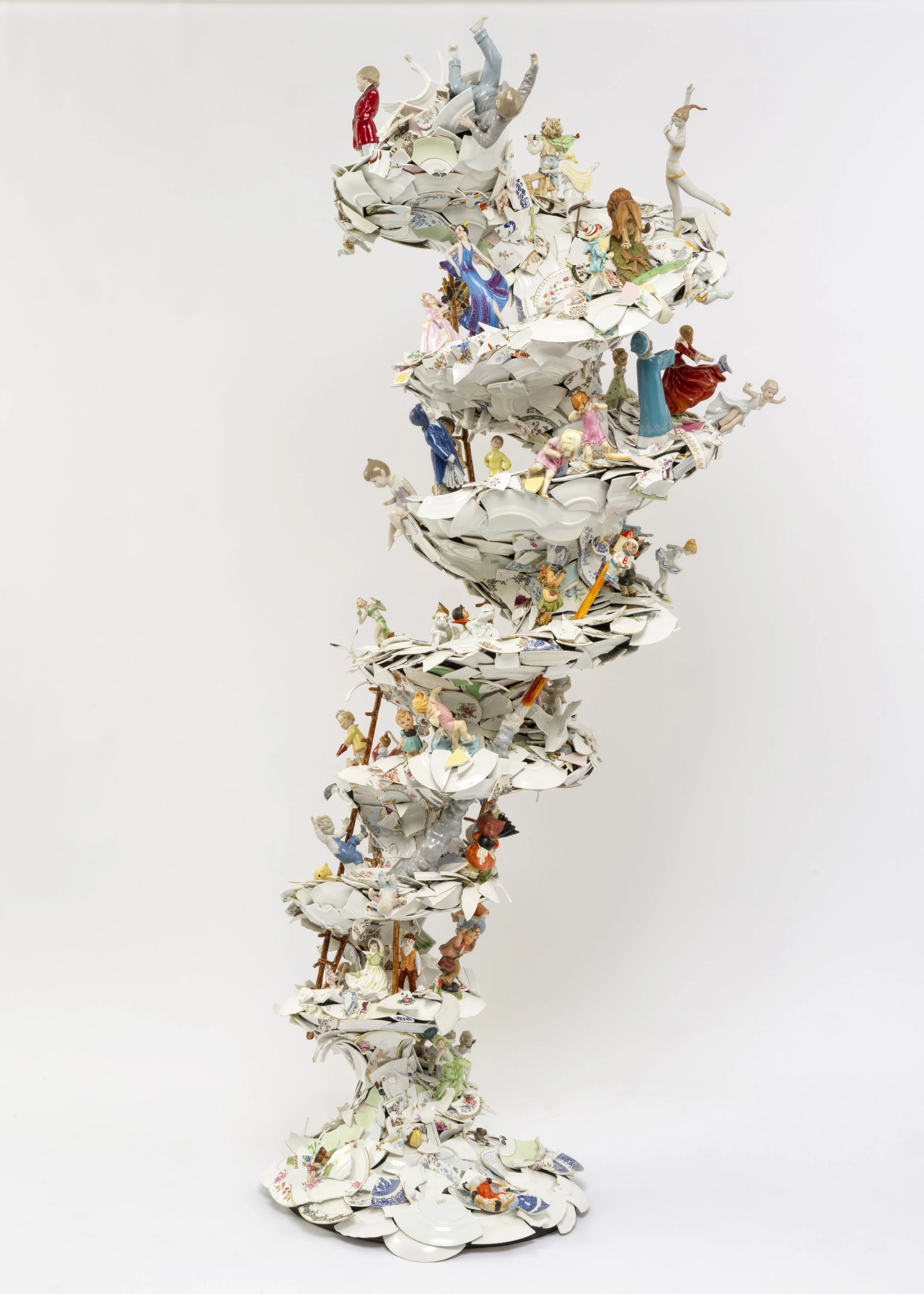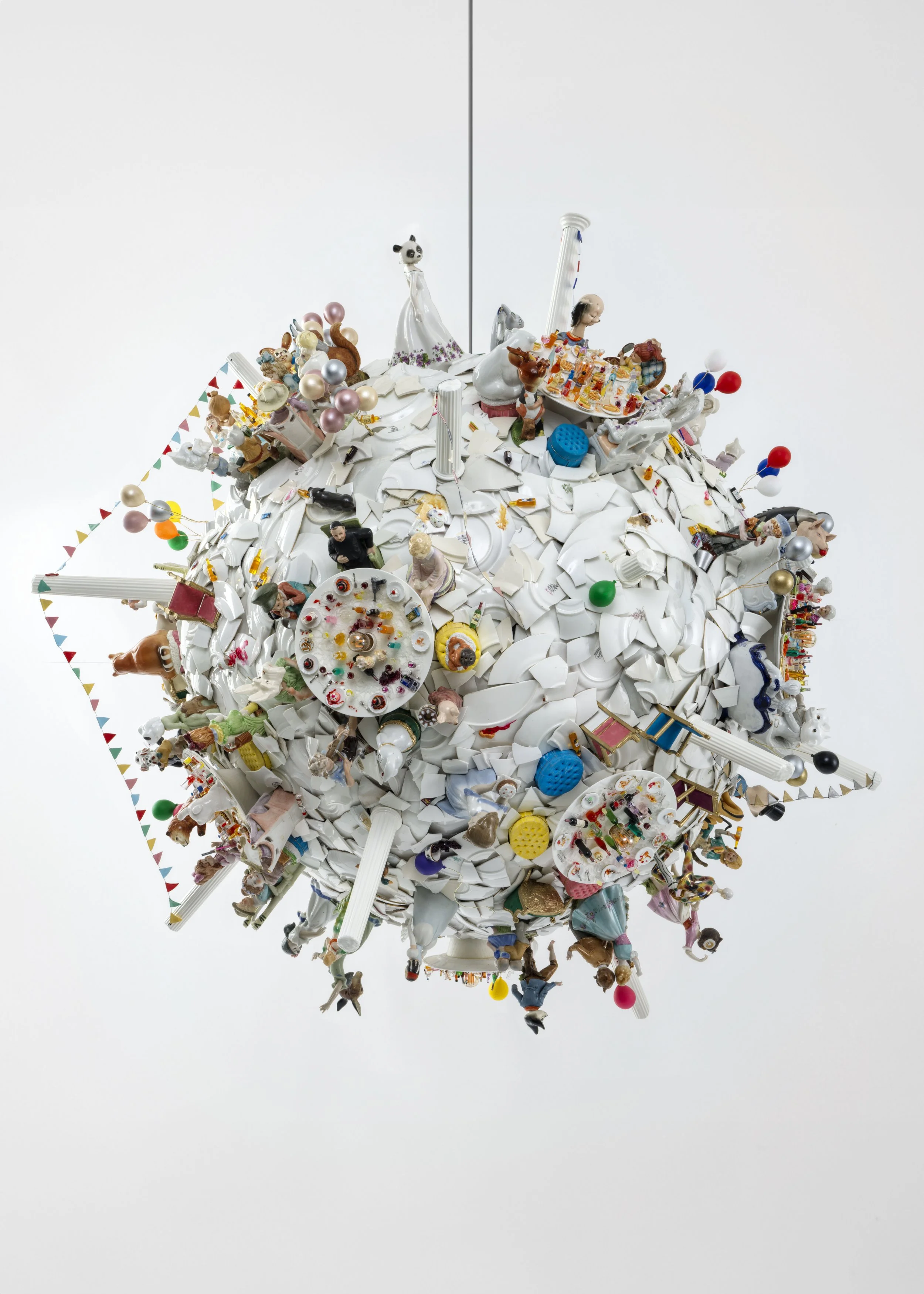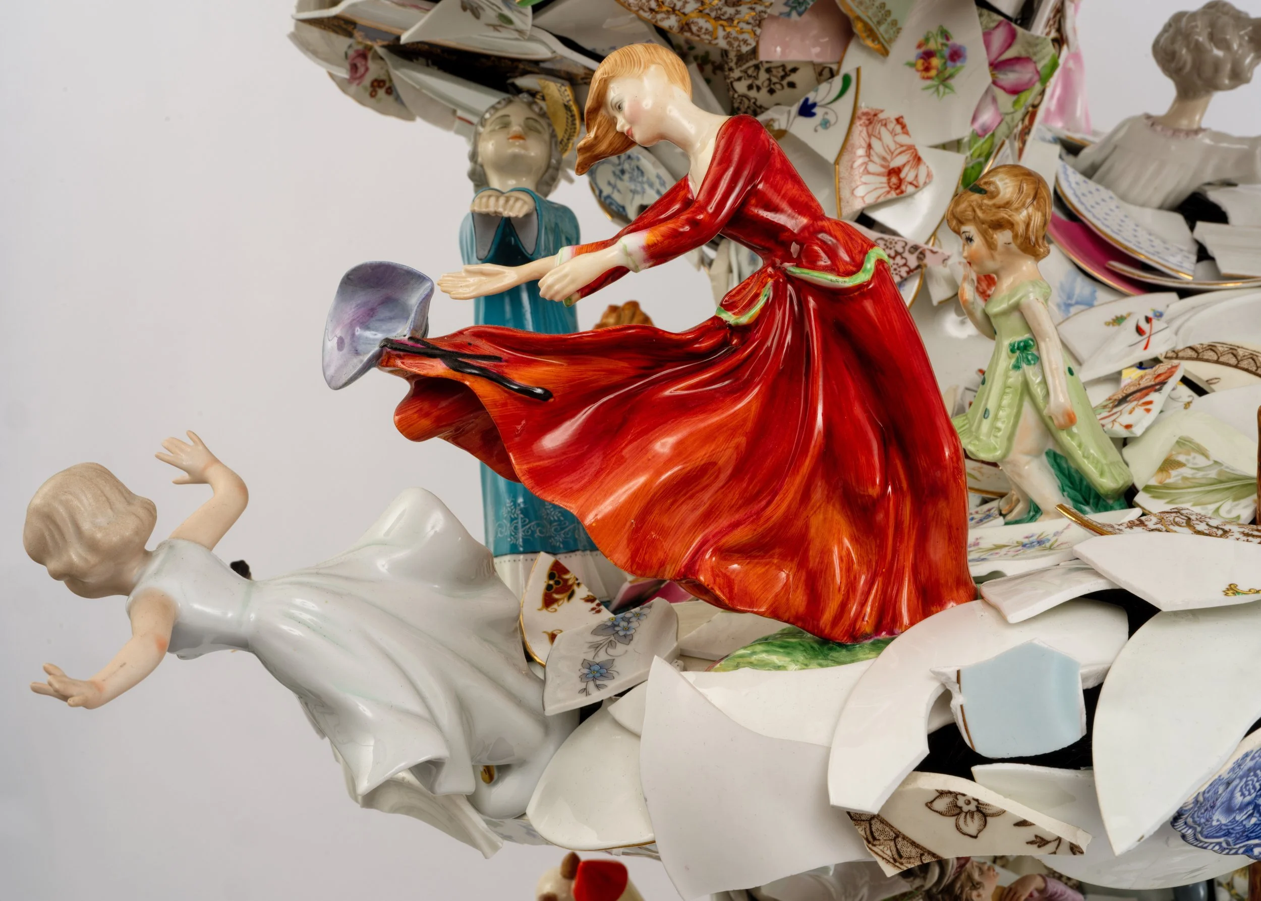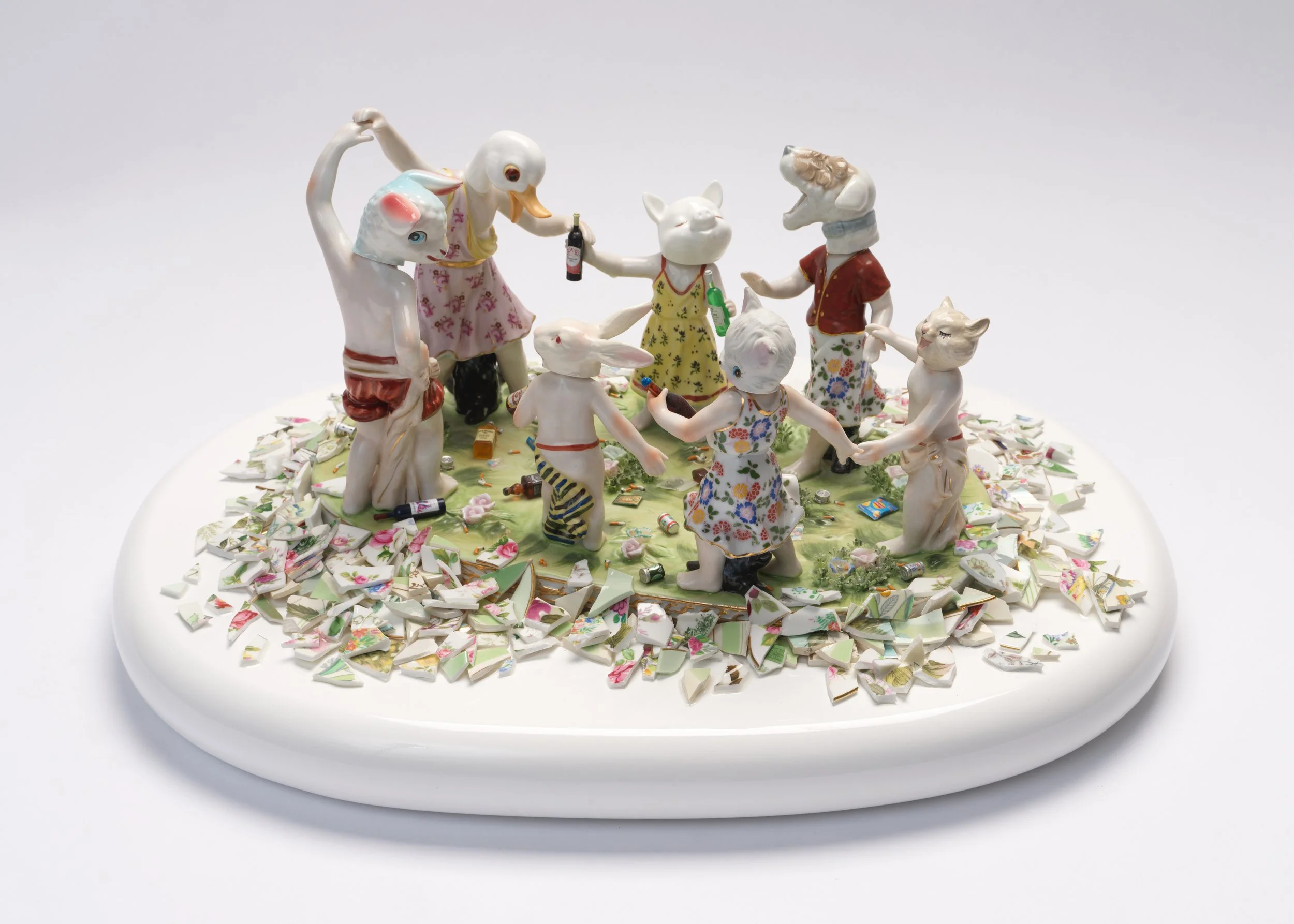 Barford uses found porcelain figurines which he decapitates and reconfigures, assembling sprawling scenes that echo the moral panoramas of artists such as Pieter Brueghel the Elder, Hieronymus Bosch and William Hogarth. Darkly comic, the works bring humour and absurdity to today’s volatility.
