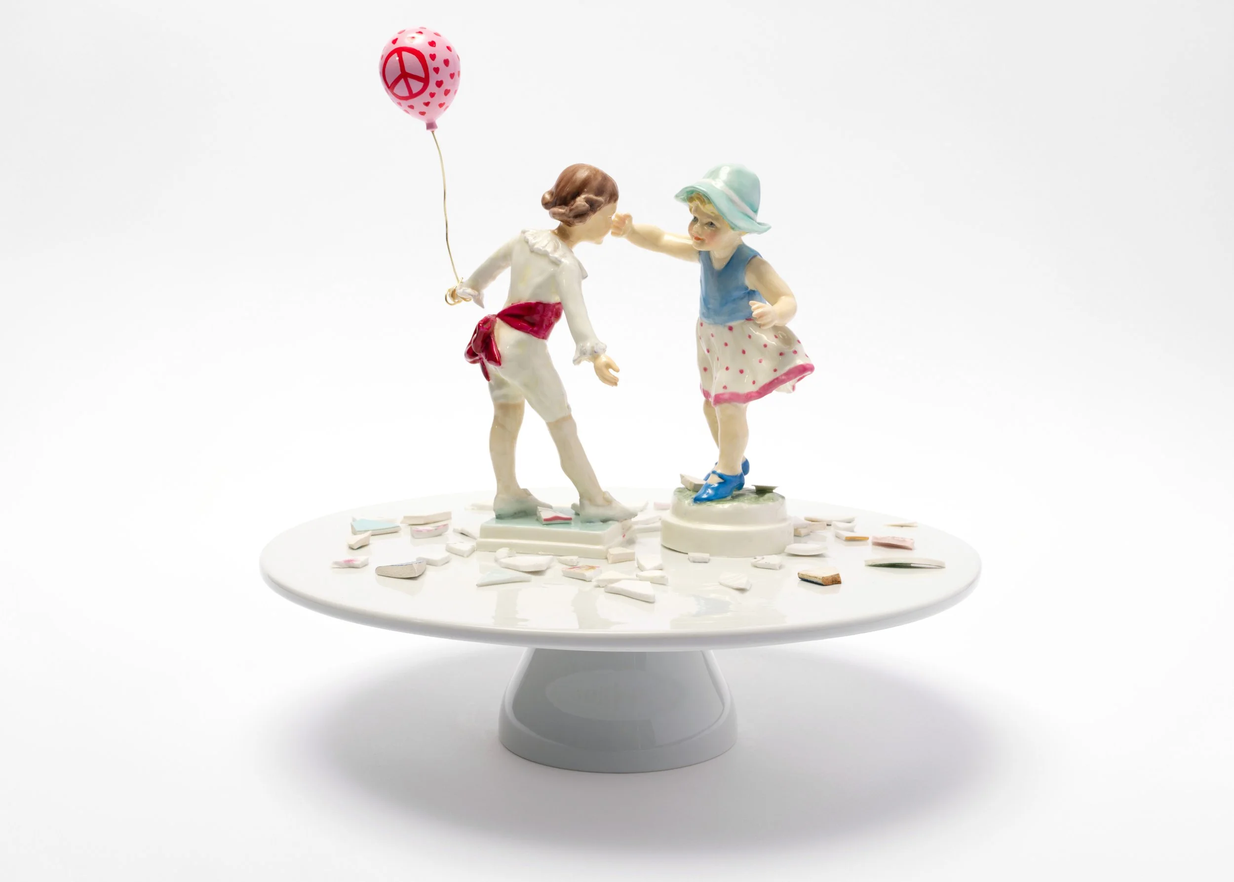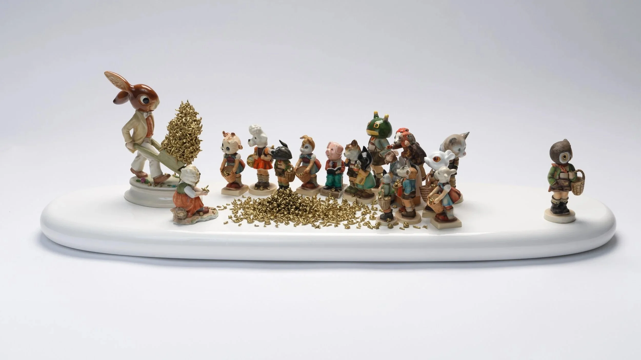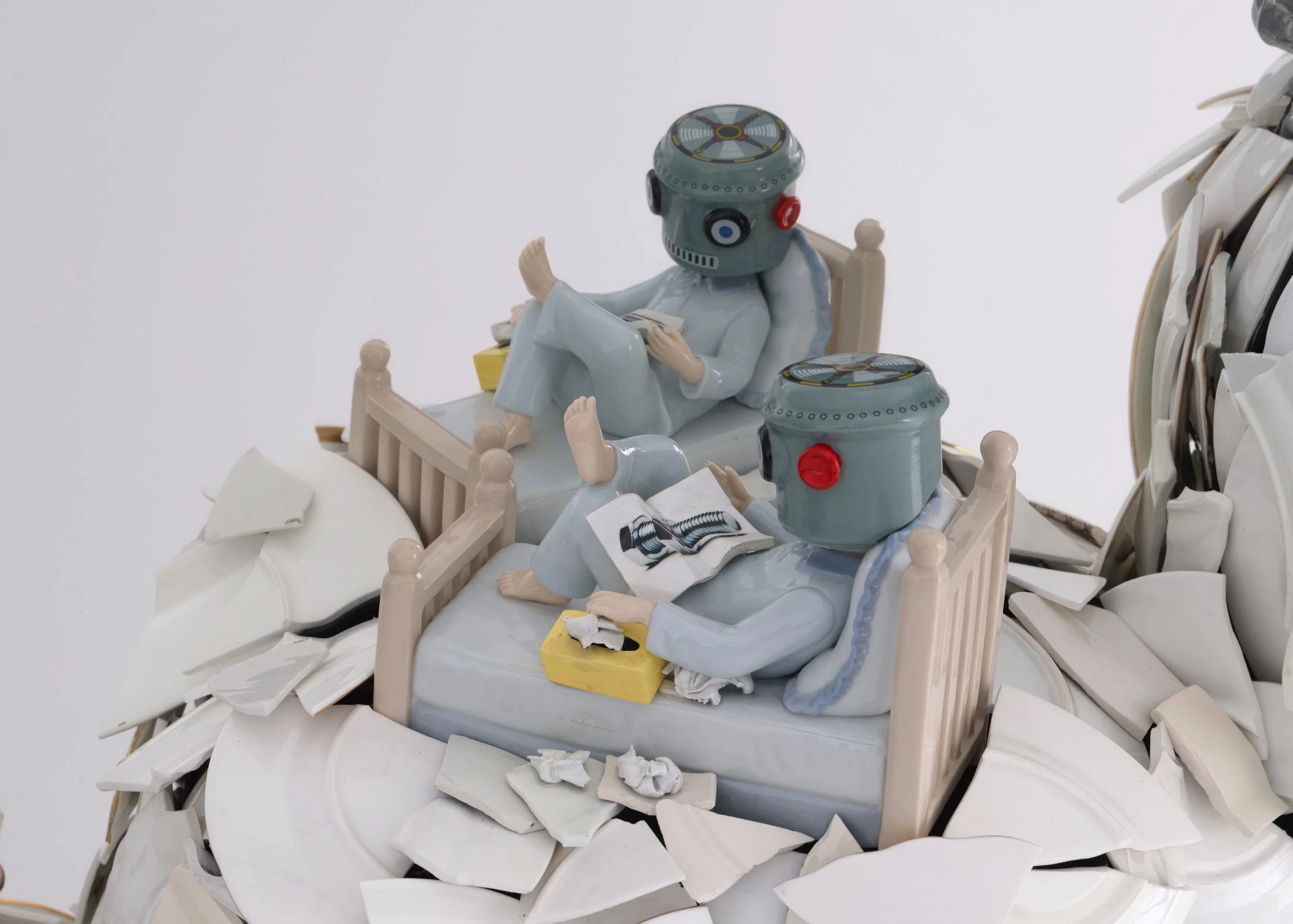 Barford uses found porcelain figurines which he decapitates and reconfigures, assembling sprawling scenes that echo the moral panoramas of artists such as Pieter Brueghel the Elder, Hieronymus Bosch and William Hogarth. Darkly comic, the works bring humour and absurdity to today’s volatility.
