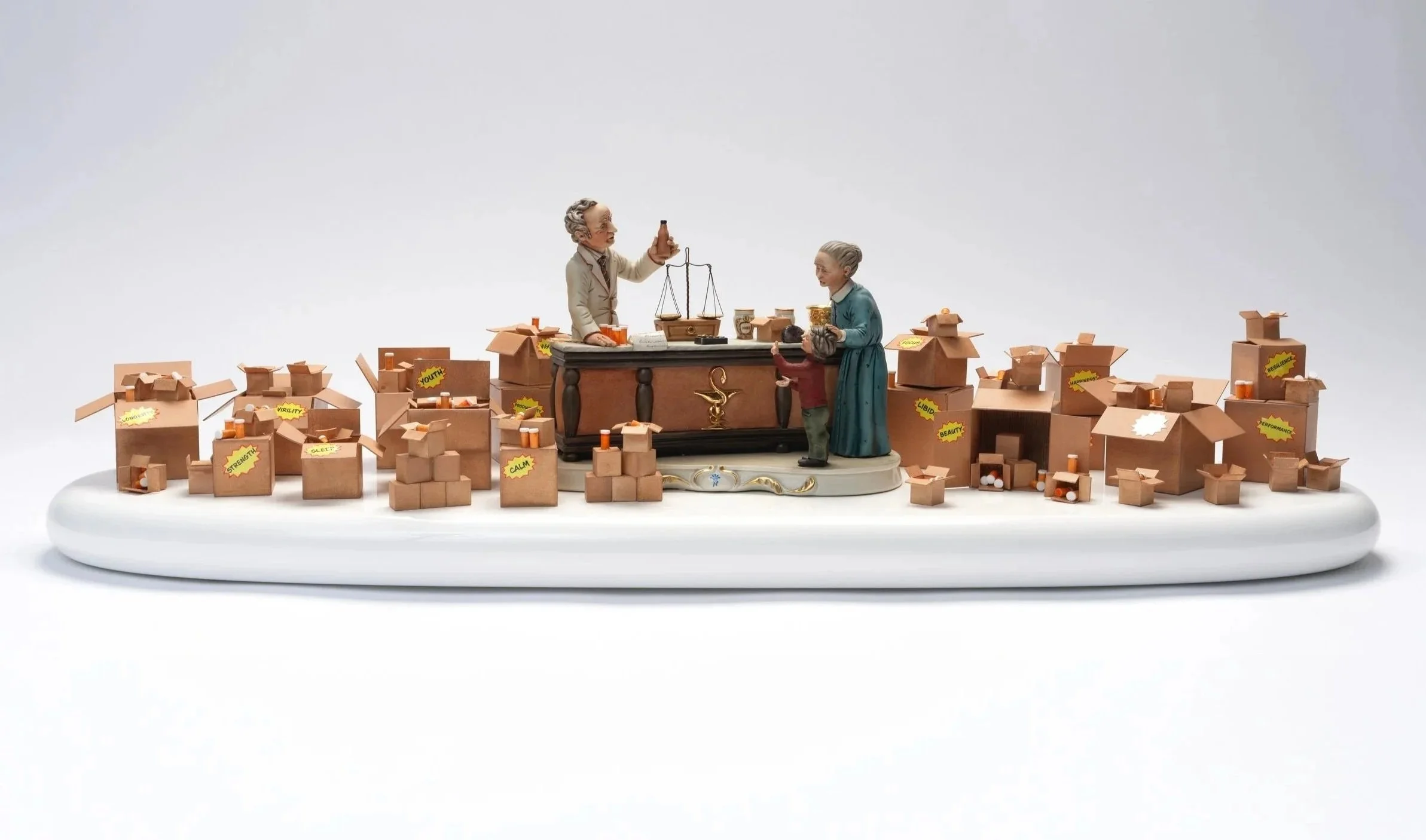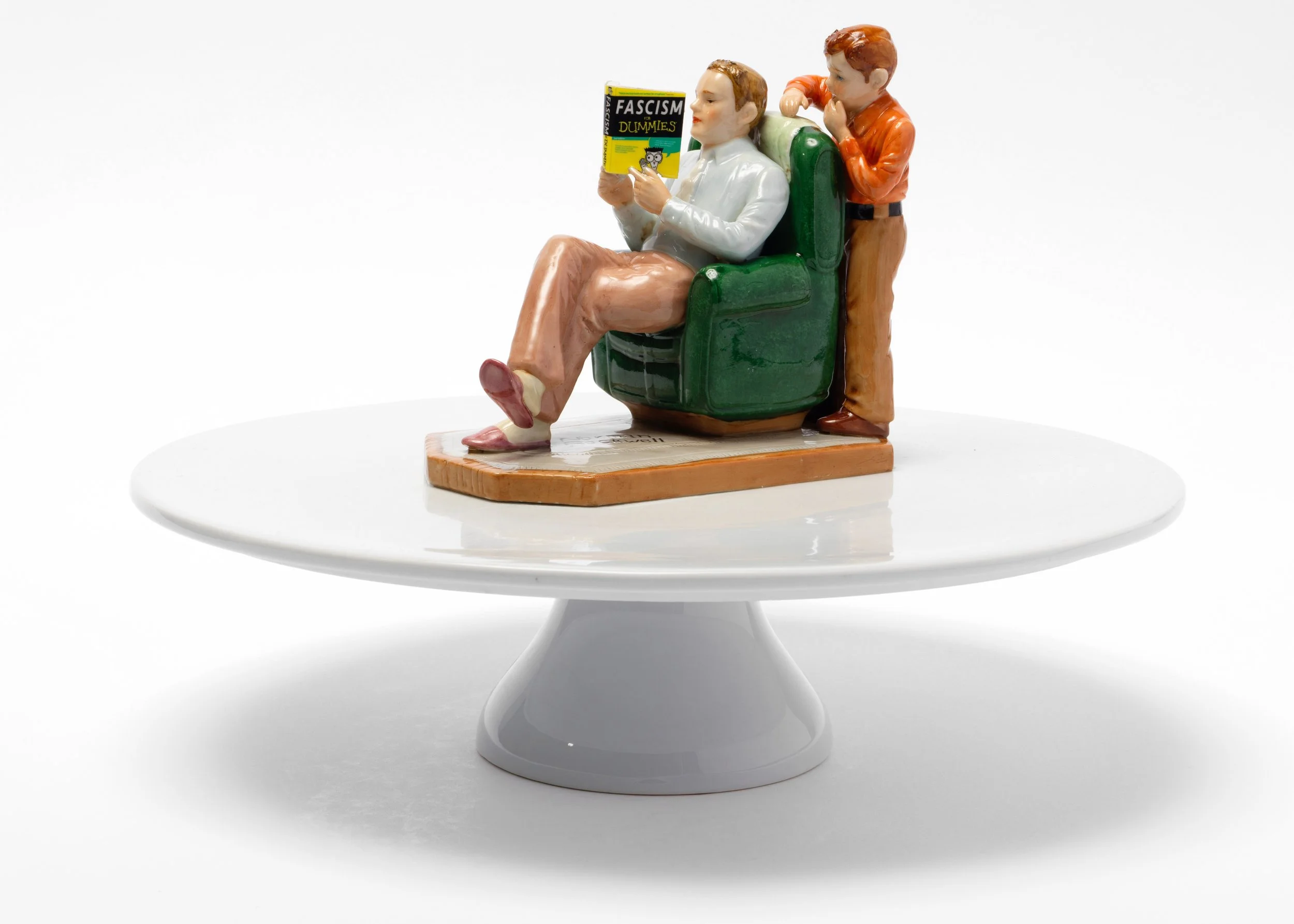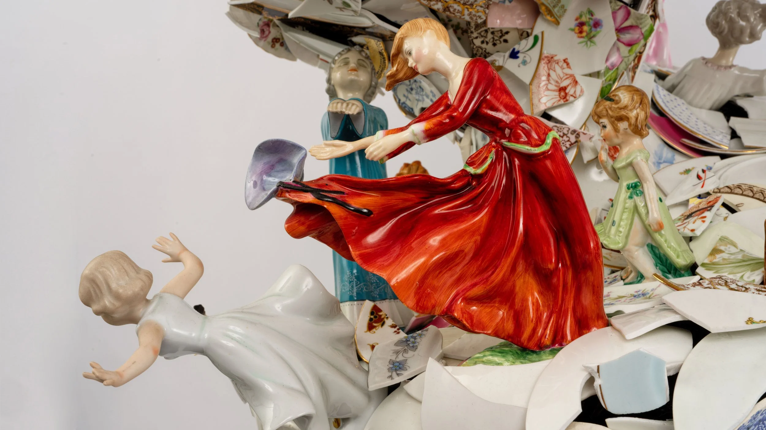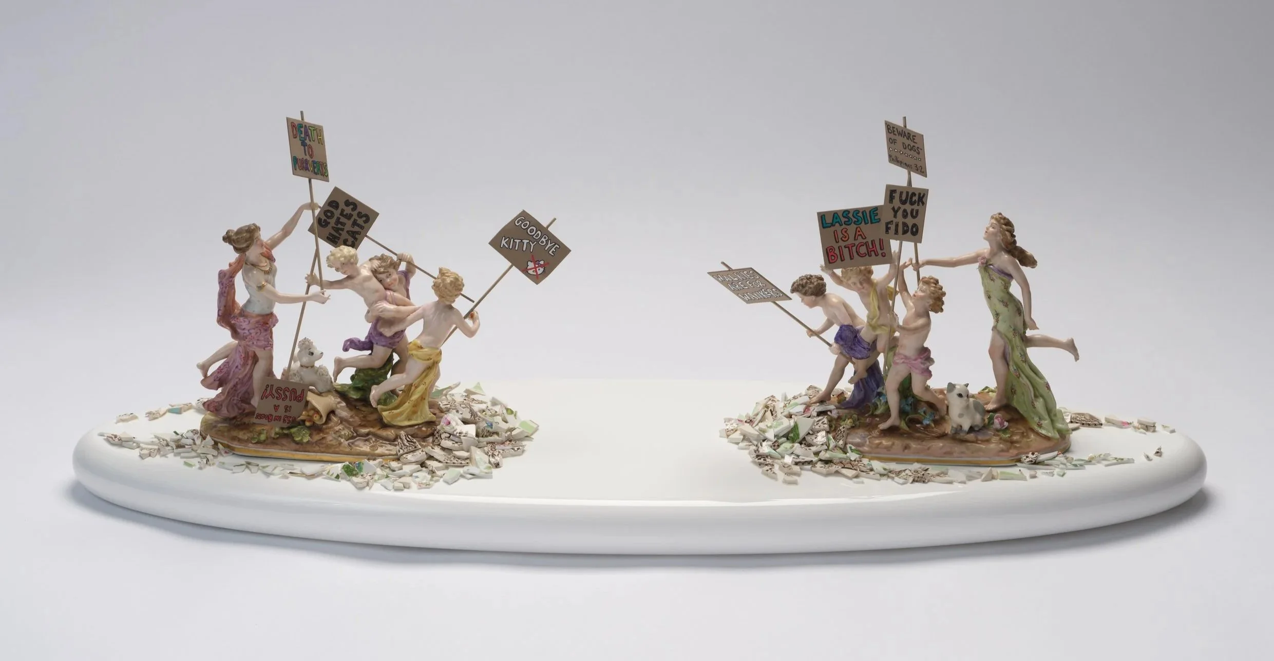 Barford uses found porcelain figurines which he decapitates and reconfigures, assembling sprawling scenes that echo the moral panoramas of artists such as Pieter Brueghel the Elder, Hieronymus Bosch and William Hogarth. Darkly comic, the works bring humour and absurdity to today’s volatility.