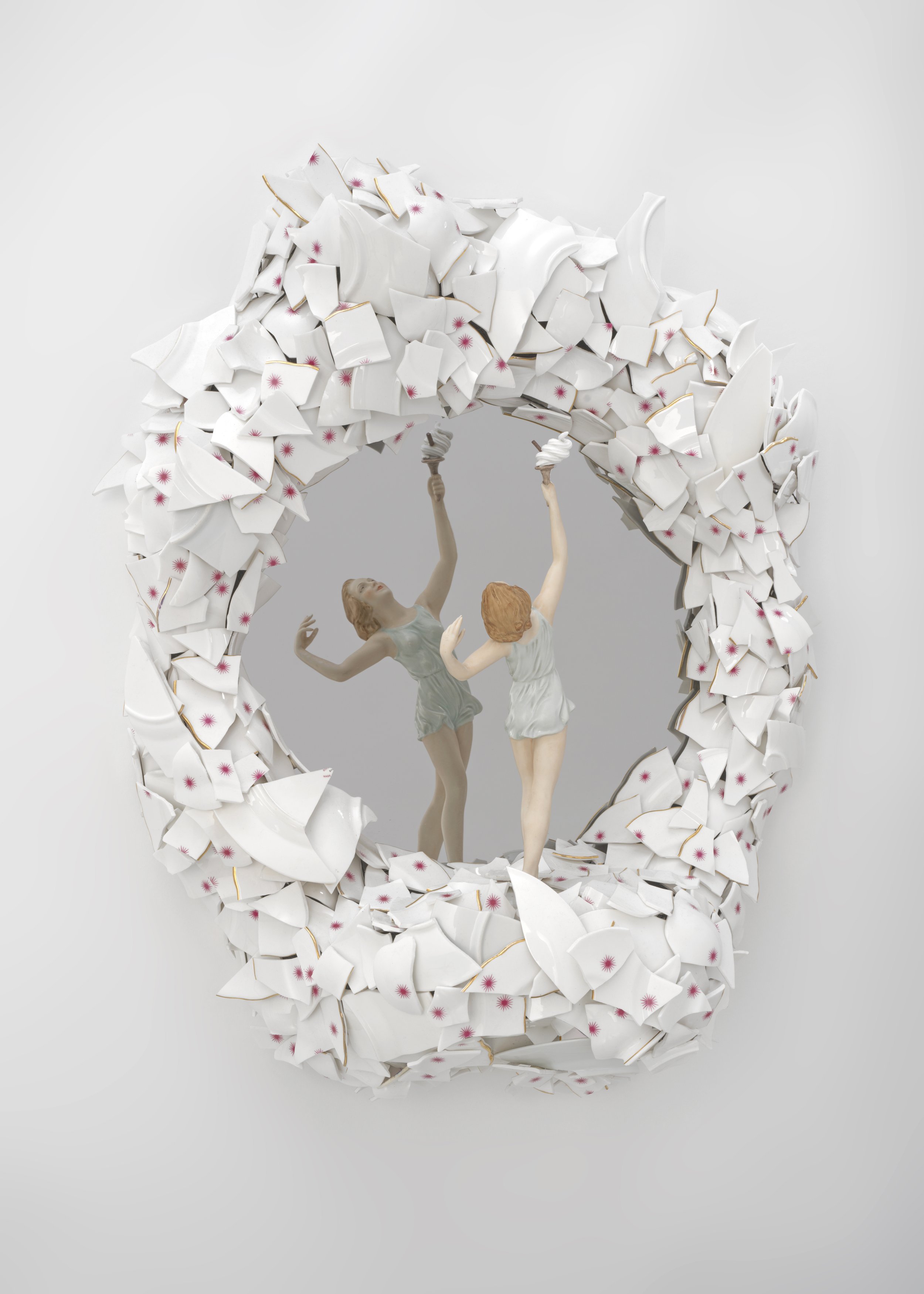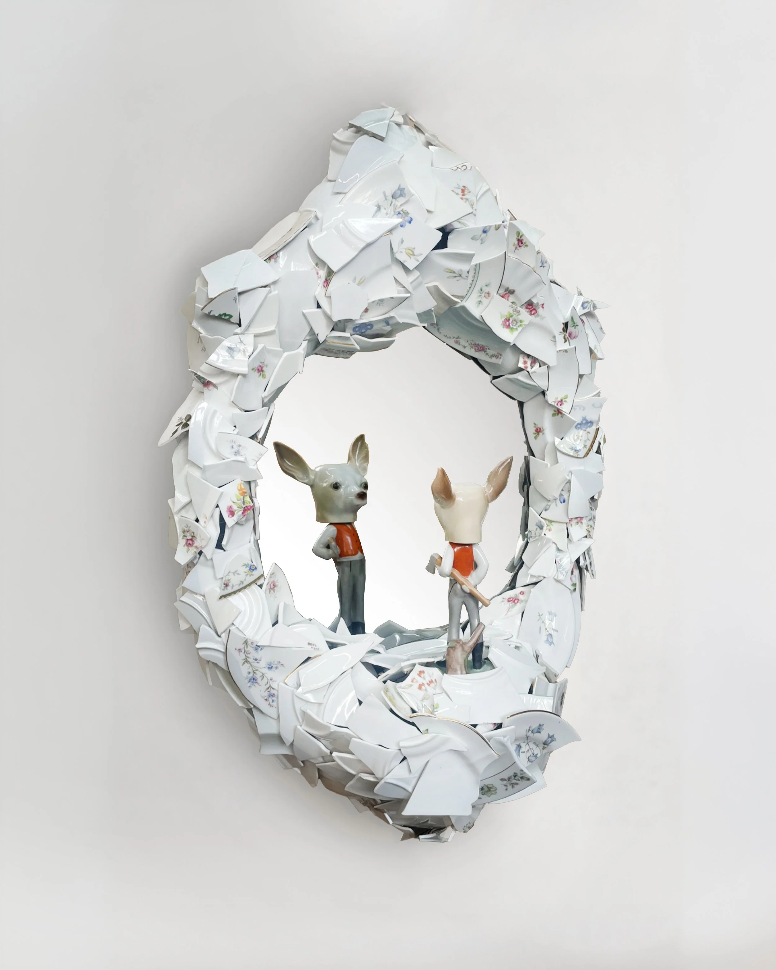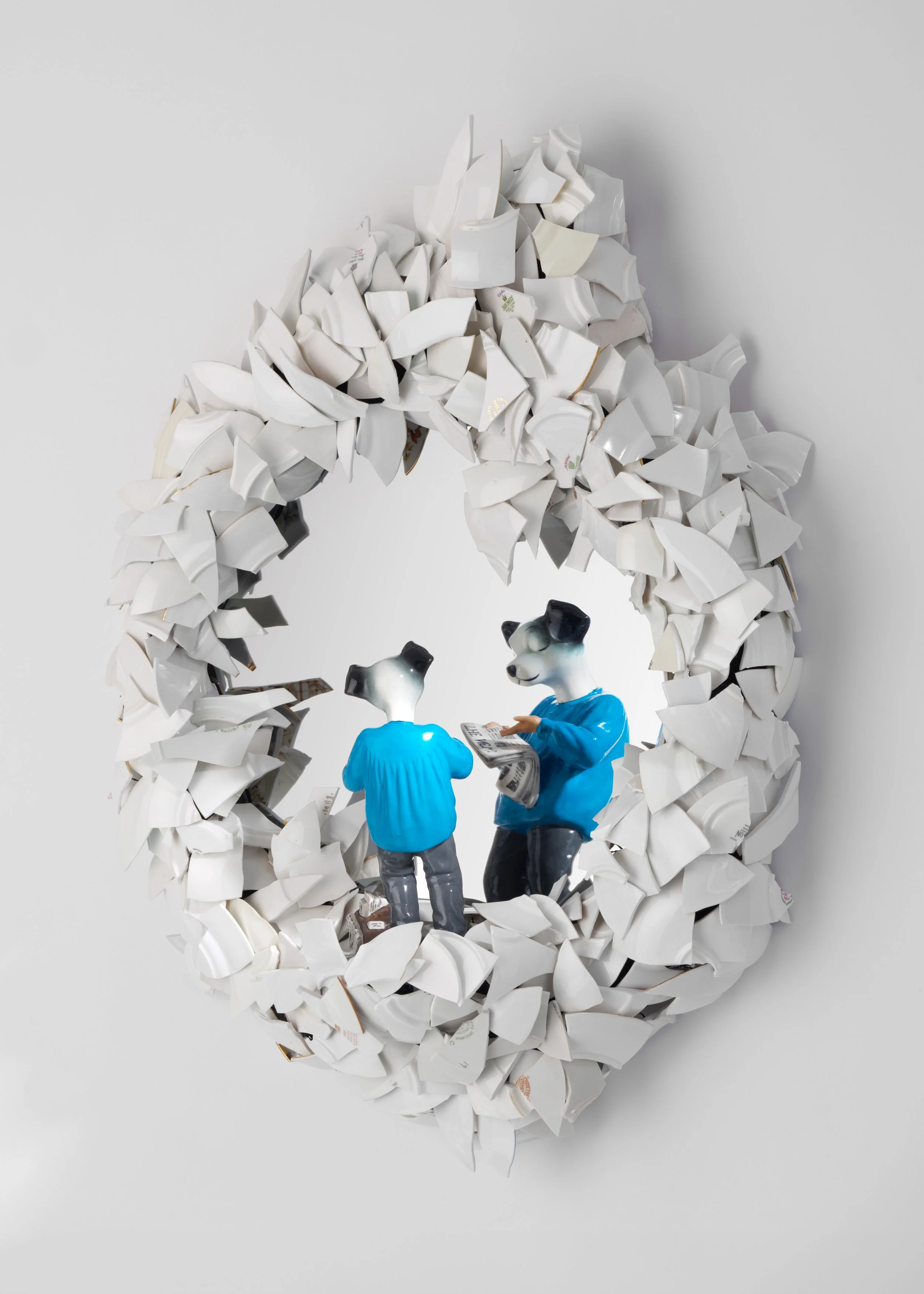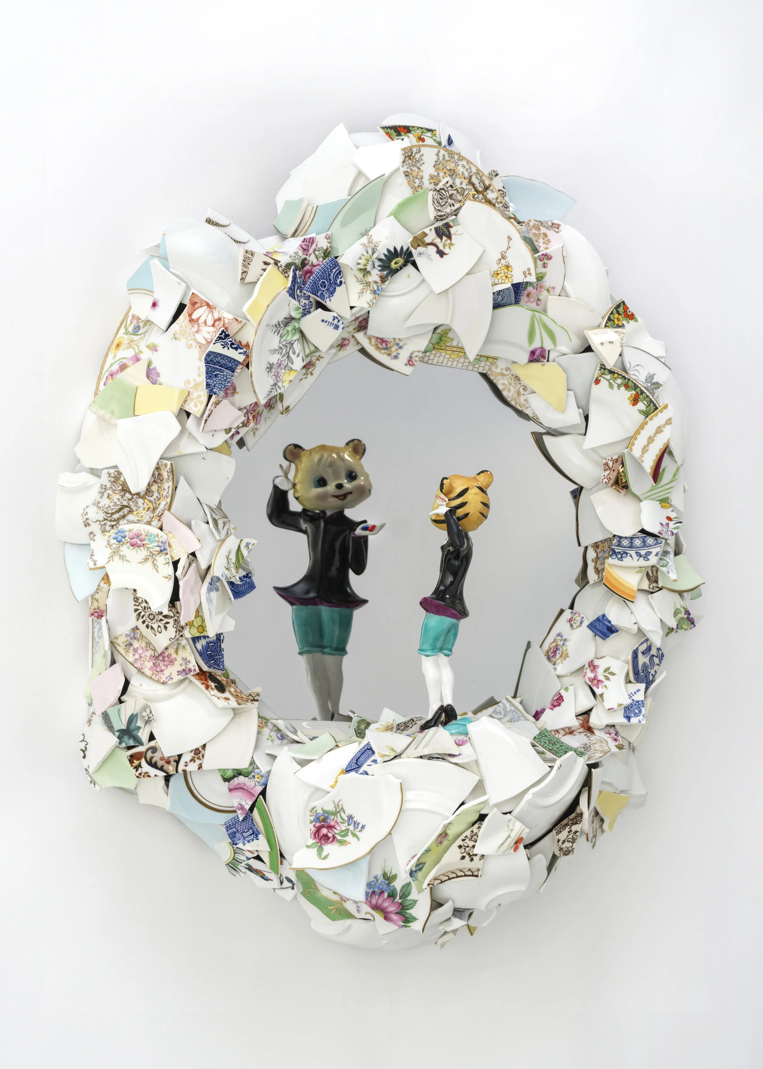 BARNABY BARFORD Mirror ''Oh hey! Snap!'' Wood, wire, found ceramic objects, convex mirror View details →