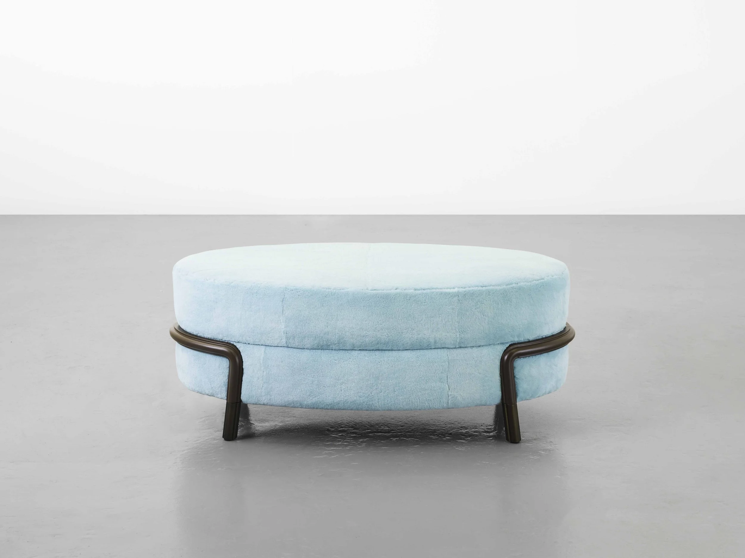 The designs fuse the area’s rustic charm with the artist's signature refined aesthetic, featuring sculpted oak cabinets, a dining table, and stools that honour the tradition of wood carving. The ‘Sanam’ series, with its fluid, organic shapes, introduces armchairs, daybeds, and ottomans inspired by the sweeping curves of the Cresta Run. Sculptural bronze lamps and rich upholstery in mohair, fur, and bespoke tweeds capture the understated elegance of St. Moritz’s winter visitors.